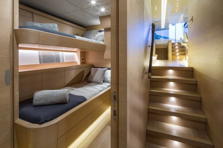 The modern yet functional interior was designed by Mark Tucker and his team at Design Unlimited. The forward section is mostly taken up by an exceptionally generous master suite comprising of a large, full-width cabin with en-suite shower room, and a study and owners’ lounge stretching down the port side complete with desk, three-sided settee and ample storage. Facing that across the centreline is a Pullman cabin for the owners to use when passage making, demonstrating that this yacht is intended for serious sailing.