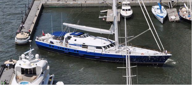 Motor yacht BAYOU has pulled into Denis Conner’s North cove port in New York City . She has a distinctive blue hull, and carries an Amphicar. Built in 1964, this Amphicar has won several car shows. She is part car and part boat. You can literally drive down the ramp, turn the propellers on and motor away!