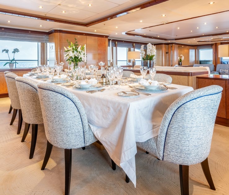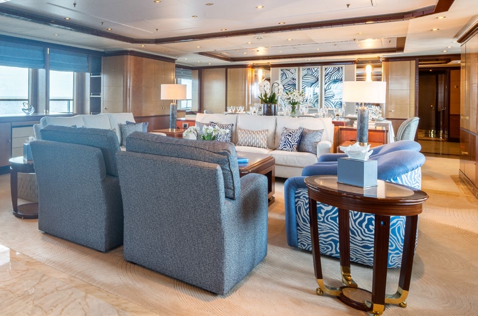 The luxury superyacht offers extensive interior living, over 3 levels, beautifully finished in the most stunning woods, marbles and bespoke fixtures and fittings. Throughout she boats a serene ambiance, using neutral fabrics and plush furnishings. An open-plan salon has a lovely lounge with a complete cocktail bar and formal dining forward. On this deck is a full beam master stateroom, with a private office/lounge and access to a well-equipped gym/massage room.