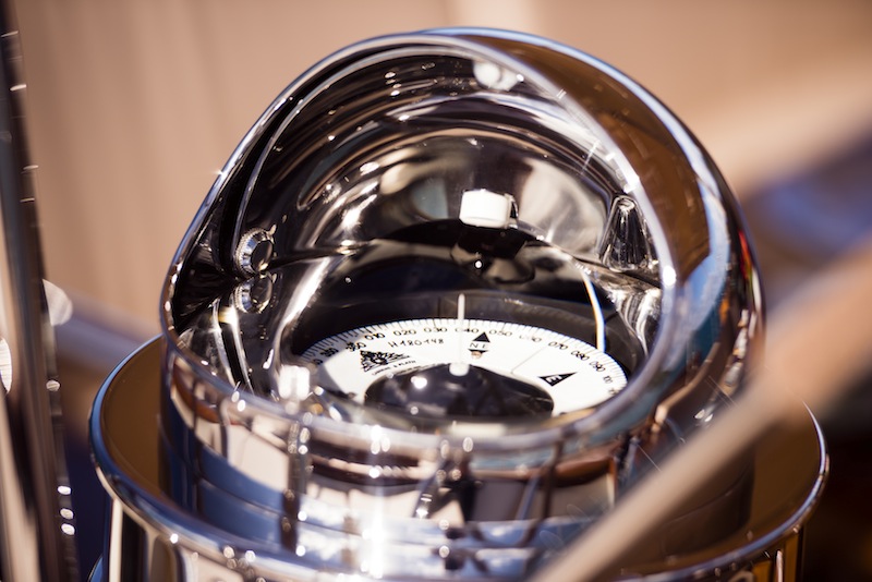 The wheel is mounted on a fine varnished teak pedestal surmounted by a traditional binnacle compass. To port and to starboard, operational controls are subtly incorporated into the cockpit infrastructure. Helm station display screens are neatly concealed within the same units, designed to glide smoothly upwards into view when in operational mode.