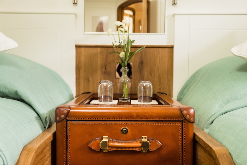 Leather-bound bedside tables, inspired by suitcases from the golden age of cruise liners, accentuate the warmth of the cabins.