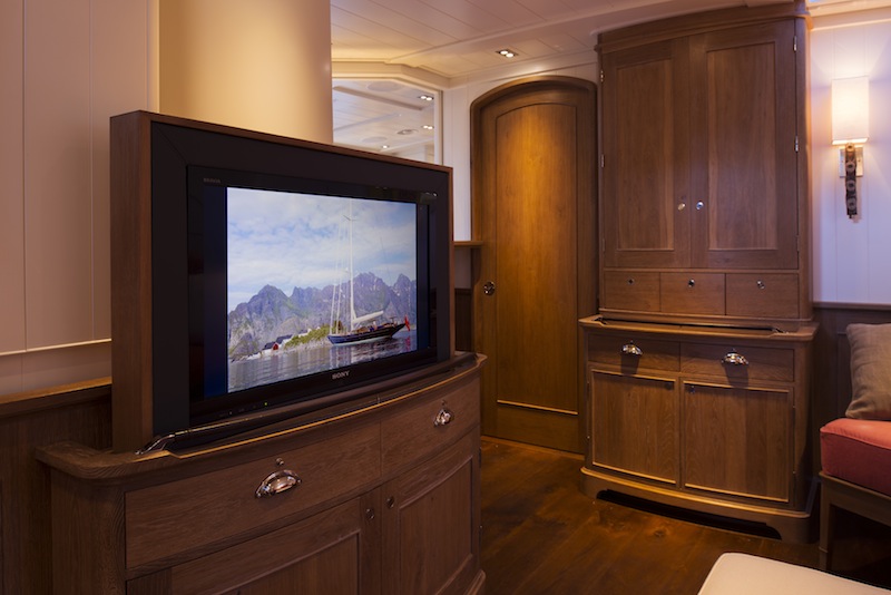 Interior designers Rhoades Young have succeeded in creating an environment below decks that is evocative of an earlier era yet offers a fresh, light and stimulating interpretation rather than a formal homage. A theme of bleached oak joinery, finished to emphasise the texture of the grain and the figuring of the wood, contrasts with darker oak flooring and white-painted panelling and deck-heads to create an intimate, almost contemporary styling. The patina of the wood has been developed through highly skilled wax-based finishing techniques that make the light oak, for example, appear aged and polished through usage. There are a numerous imaginative design features including saddle stitched leather-bound bedside tables, inspired by suitcases from the golden age of cruise liners, that accentuate the warmth and charm of the cabins. Stepping down into the main deck house from the cockpit, one encounters a wonderfully light and airy space, thanks to large windows on three sides, skylight hatches overhead and extensive white painted panelling. To port, a stylish oak dining table, hand-stained to match the oak flooring, seats eight guests while, to starboard, there is informal seating either side of a table that conceals a navigation station.