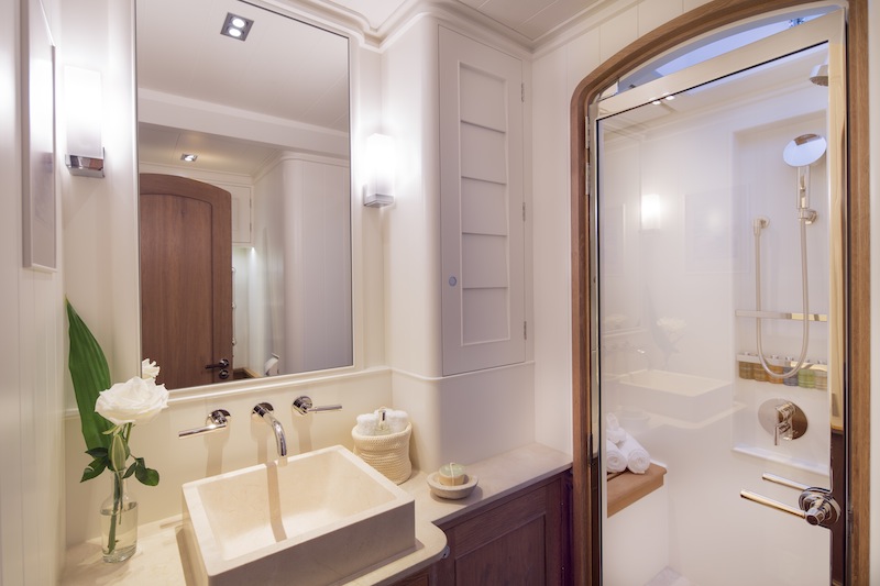 Returning to the main deckhouse, stairs aft lead to the principle owner and guest accommodation where beautifully fitted twin cabins are situated to port and starboard with the owner’s full-beam suite aft. All guest cabins enjoy the benefit of natural light through elegant oval portholes in the hull as well as light and air from overhead skylights.