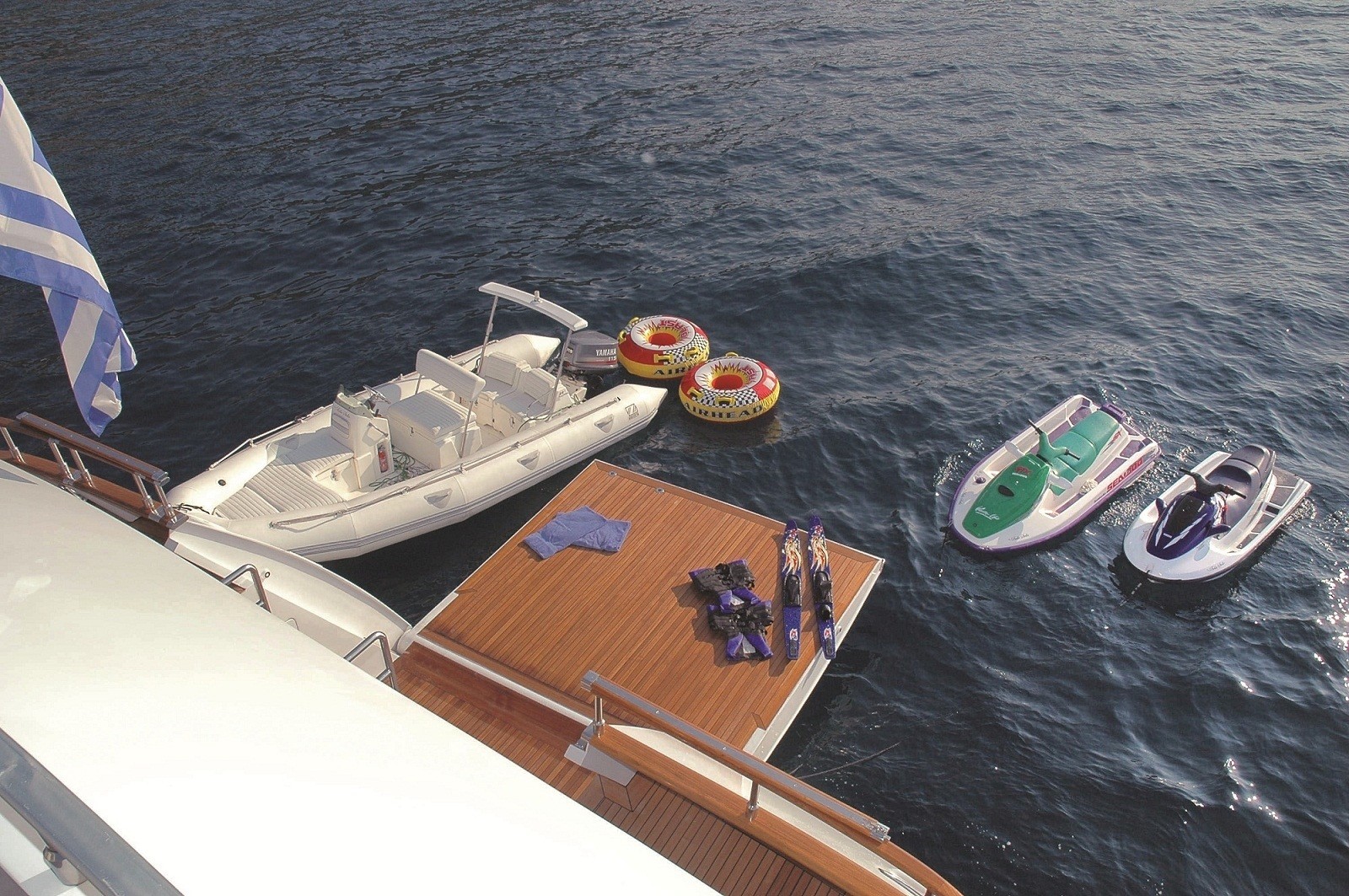 M/Y BELLA STELLA has ample exterior living, which include a shaded aft deck, with seating and alfresco dining, this area also leads to the extended swim platform and water toys. An upper deck hosts the tenders while at sea and can be opened out while at anchor. Her sundeck has seating, sun pads and the all-important Jacuzzi.