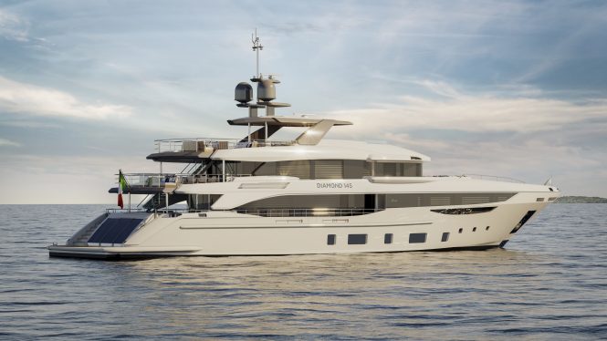 A second 44m/146ft DIAMOND 145, the flagship of the Class category, was also among the hulls sold. The DIAMOND 145 has a transatlantic range of 3,800 nautical miles while cruising at 11 knots and provides an excellent balance of indoor and outdoor spaces: The Jacuzzi and main sunbathing area is placed on the bow to create a larger lounge and alfresco dining area on the sundeck.
