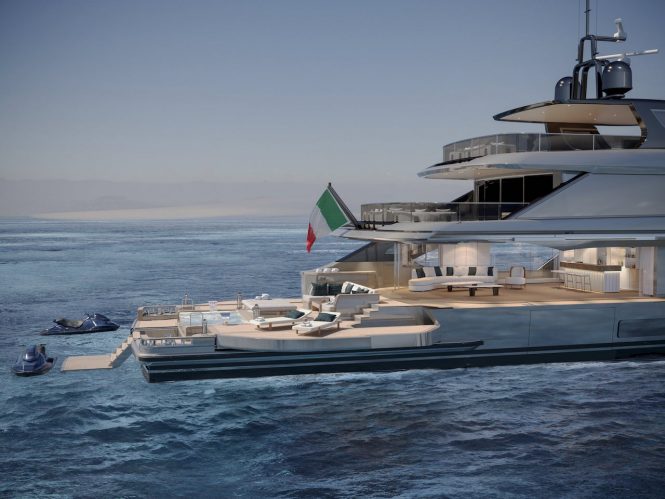 One of the most striking design features of the new model is the two lateral stern platforms that open out to create easy access to the water. The extensive lower deck swim platform is fitted with an infinity pool which matches beautifully with the significant amount of glazing across the decks which create loft-like spaces.