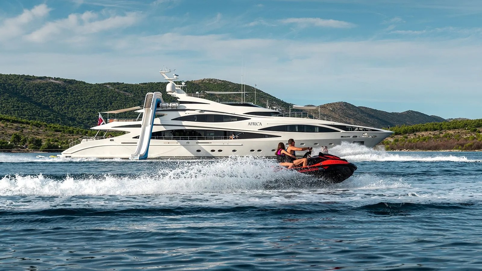 Cruising the East Mediterranean this summer there will be plenty of outdoor time to be had, and AFRICA I certainly delivers in this aspect. The Benetti yacht boasts 3 levels, these include the main deck aft, with shade and optional dining, plus steps leading to all the water toys on the swim platform.