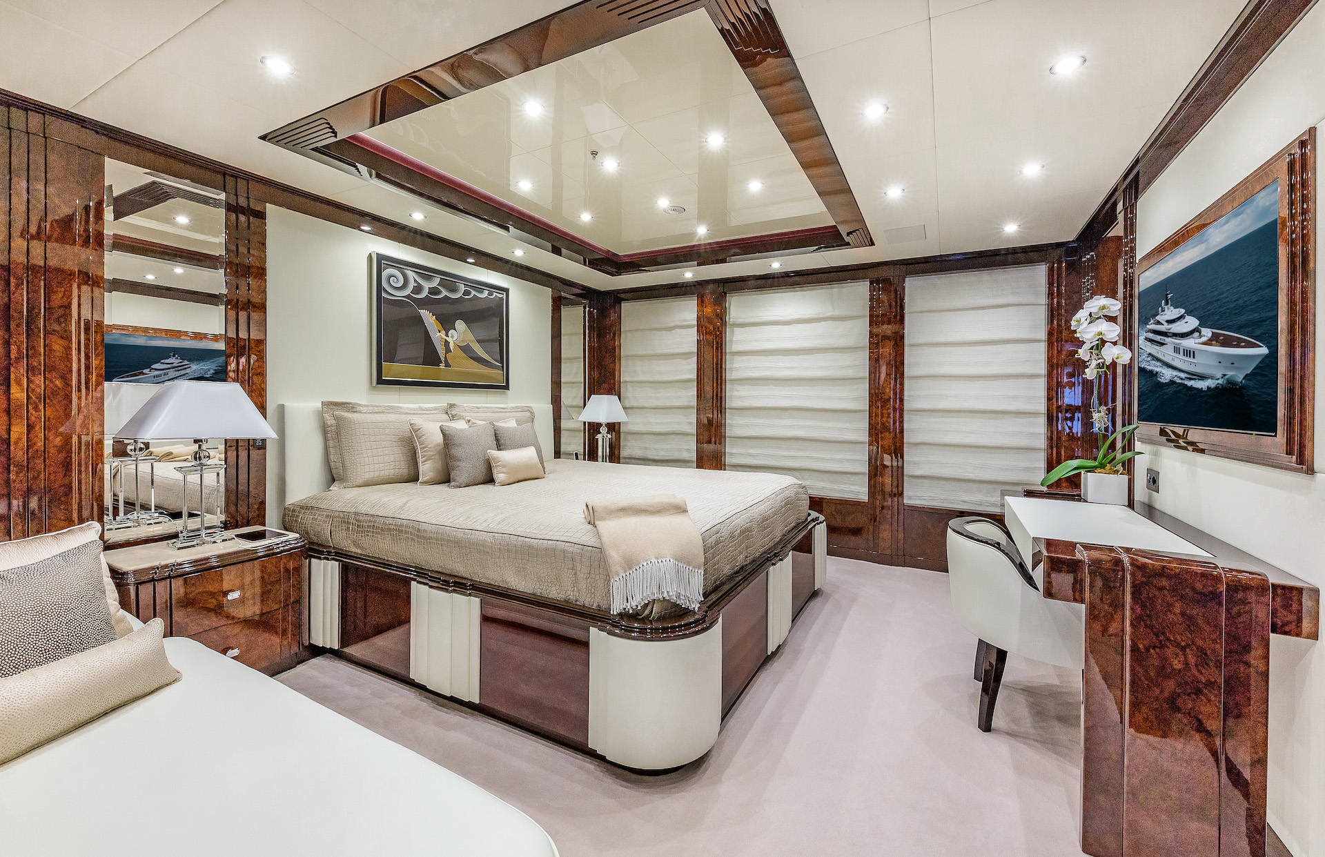 The interiors feature Art Deco and Liberty styling with opulent Armani fabrics, futuristic materials and geometric shapes. Accommodation is offered across 6 spacious staterooms, including 2 master suites, 2 VIP staterooms and 2 guest cabins.