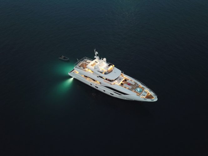 The 29m/95ft DELFINO 95 model also features exteriors from Giorgio M. Cassetta and interiors by the Benetti in-house team. Similar to the MEDITERRANEO 116, there are four decks and accommodation is for up to 10 guests over 5 en-suite cabins, the Master suite located on the main deck forward and the remainder guest cabins on the lower deck. The crew accommodation on the lower deck is also in three double cabins, with the Captain’s cabin on the bridge deck.