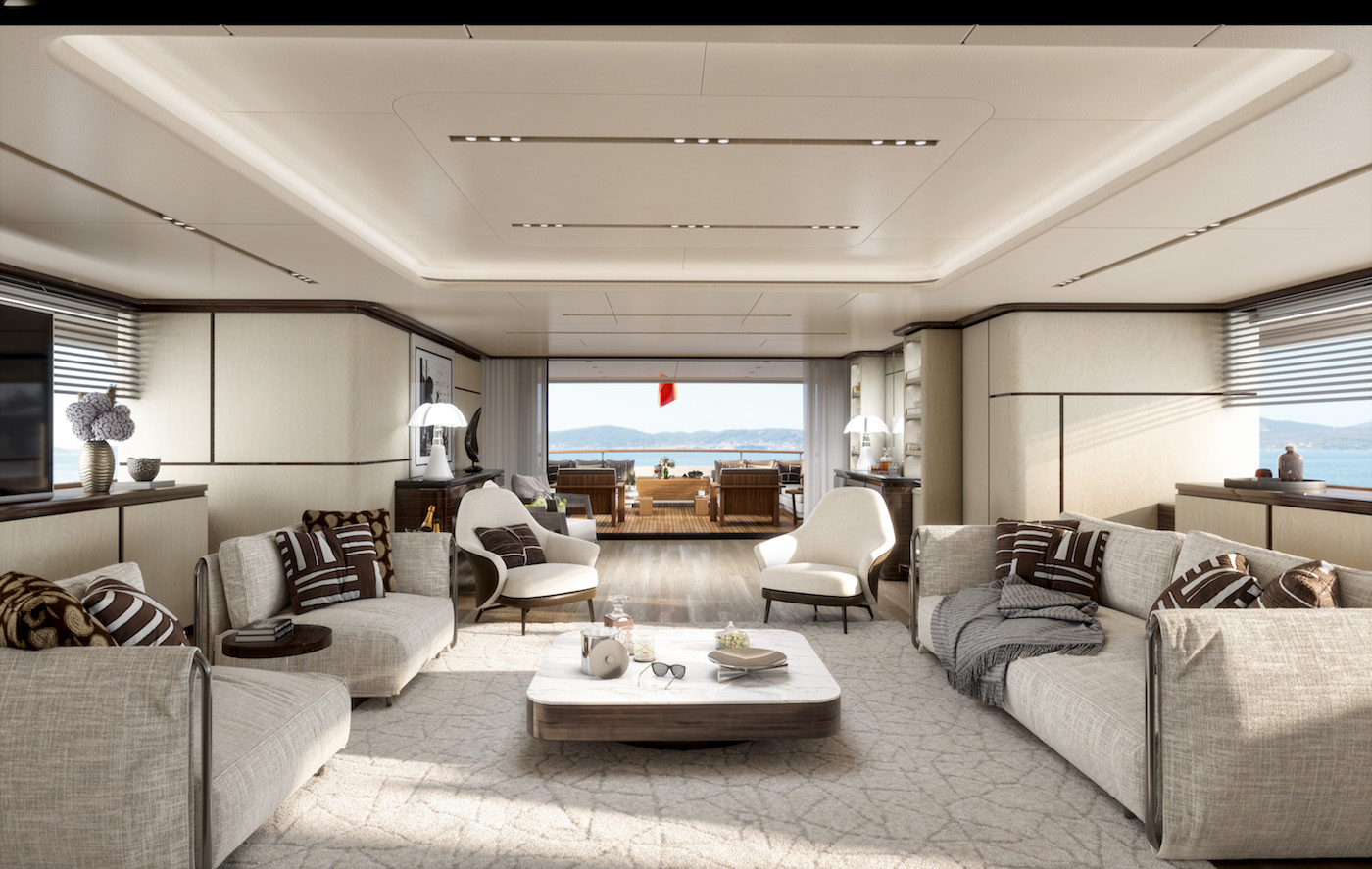 Construction began in 2021 with a steel hull and aluminium superstructure from the design team at Cassetta Yacht Design. Outside she is characterised by her ‘party deck’ on the bridge level served by a huge bar and choice of lounge areas. Up steps to the 90sqm sun deck finds a beautiful jacuzzi with far reaching views.