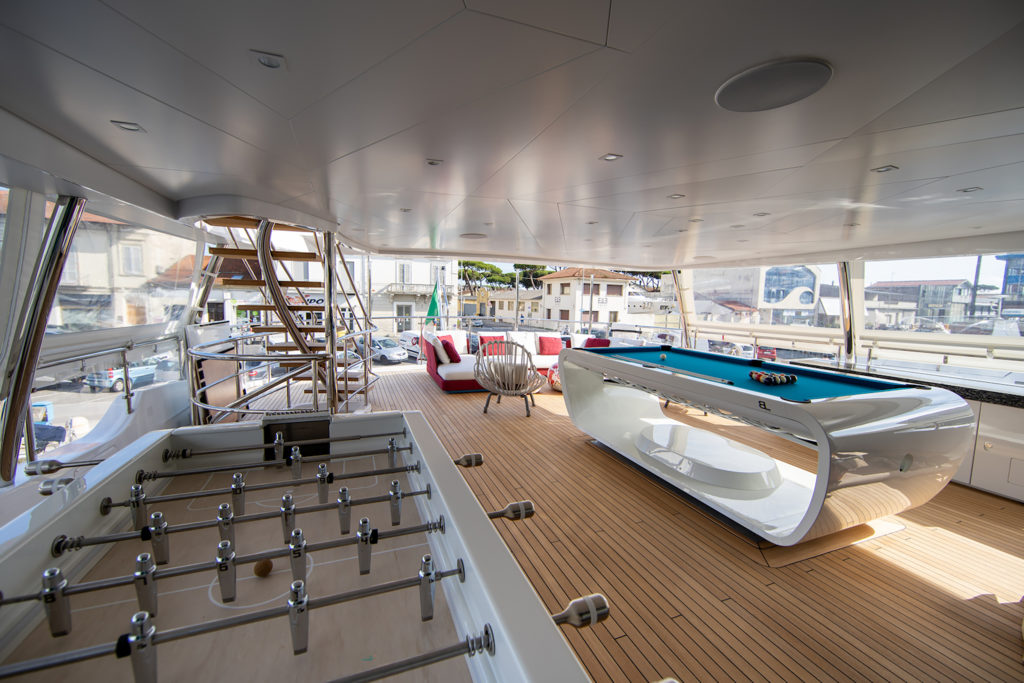 M/Y HAPPY ME has some unique additions as well: The main deck aft has two games tables in the shade for all-day outdoor use. The sun-drenched foredeck provides a C-shaped sofa and two tables for unwinding with panoramic views, and a broad sunpad and Jacuzzi on the bow.