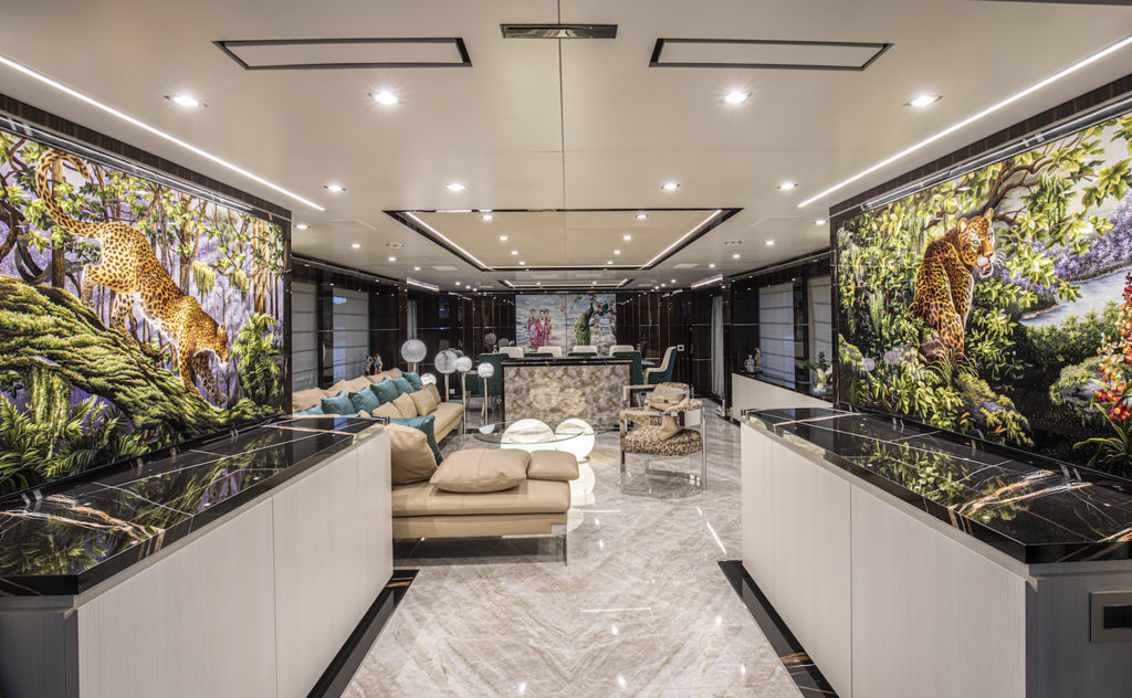 The luxury yacht is Classic Supreme 132 model that provides an excellent balance between indoor and outdoor living, and suited to large celebrations as much as laid-back family charters. The interior styling from Zuretti combines elegant monochrome styling typical of the shipyard with a burst of colour and other eye-catching elements, such as the back-lit semi-precious stone bar. An Oriental theme is evident in the frescoes that decorate the salons and bedroom headboards, further enhanced by striated wooden panelling finished in gloss.