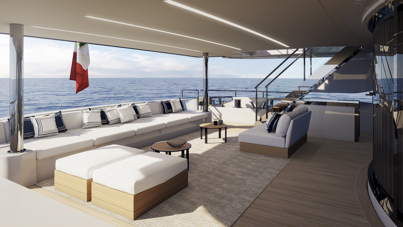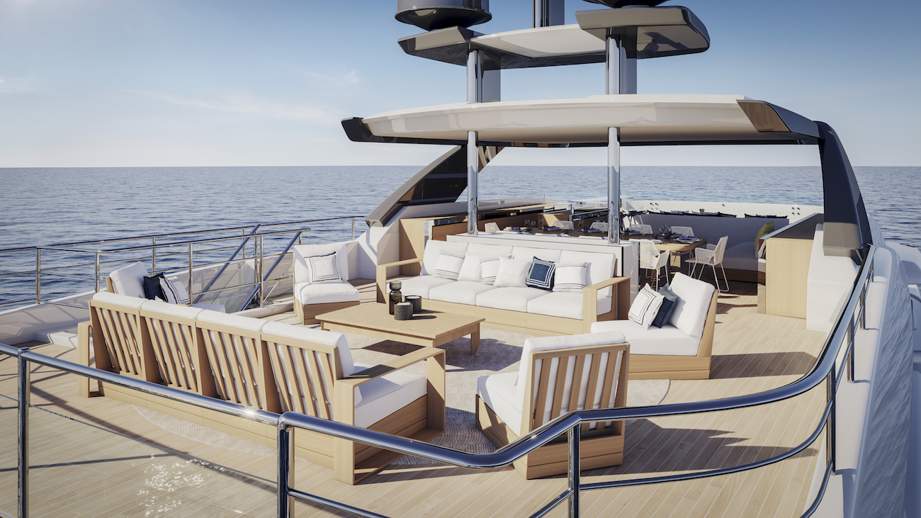 The sundeck boasts over 115m2 of space that can be furnished as the Owner desires, with the current design concept showing a massive forward sunbathing area, a shaded lounge, alfresco dining area and bar beneath the hardtop, and a sun-exposed lounge along the stern.