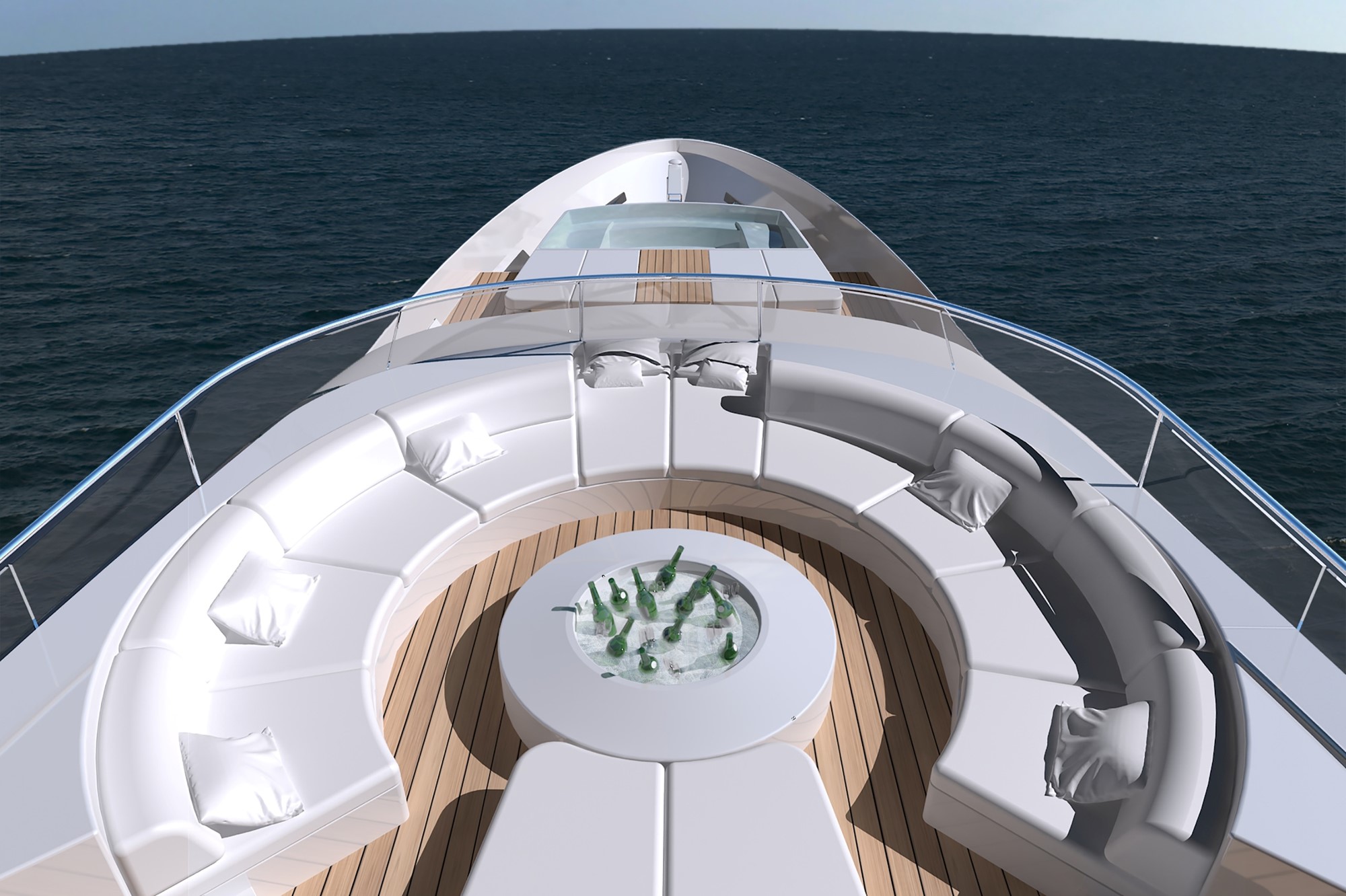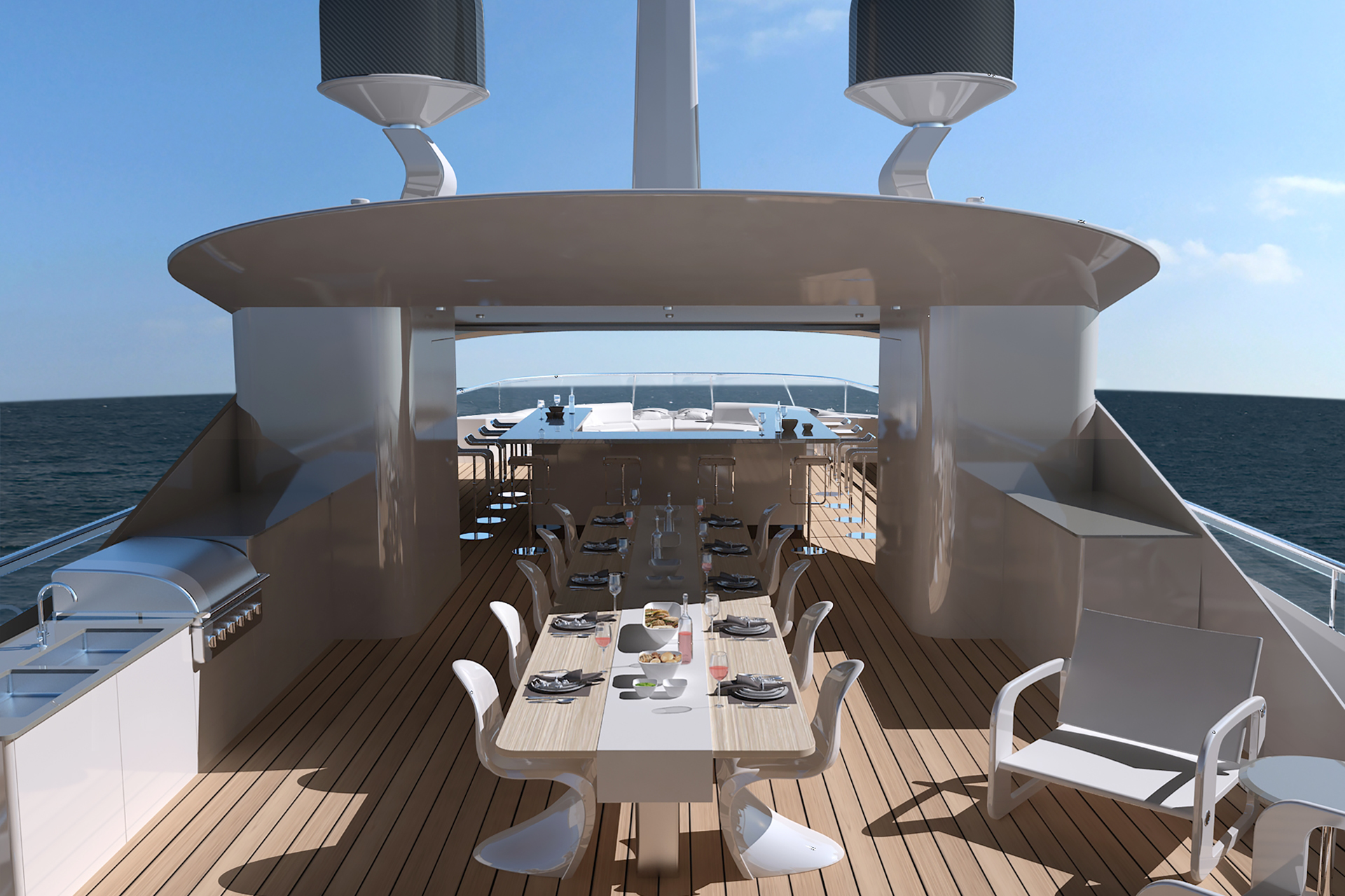 The sporty side view boasts a strong feature line running from the front to the rear on all three decks. These lines have been inspired by a perfect regressing wave, creating the visual of a sensual ‘rear’ hip sweeping up like a wave. Sculpt and proportions are featured throughout, with imposing sporty statement in motion. Extended carbon fibre shark fins provide her with an aerodynamic and smooth look, and allow the functionality of incorporating lights to illuminate the ocean at night.