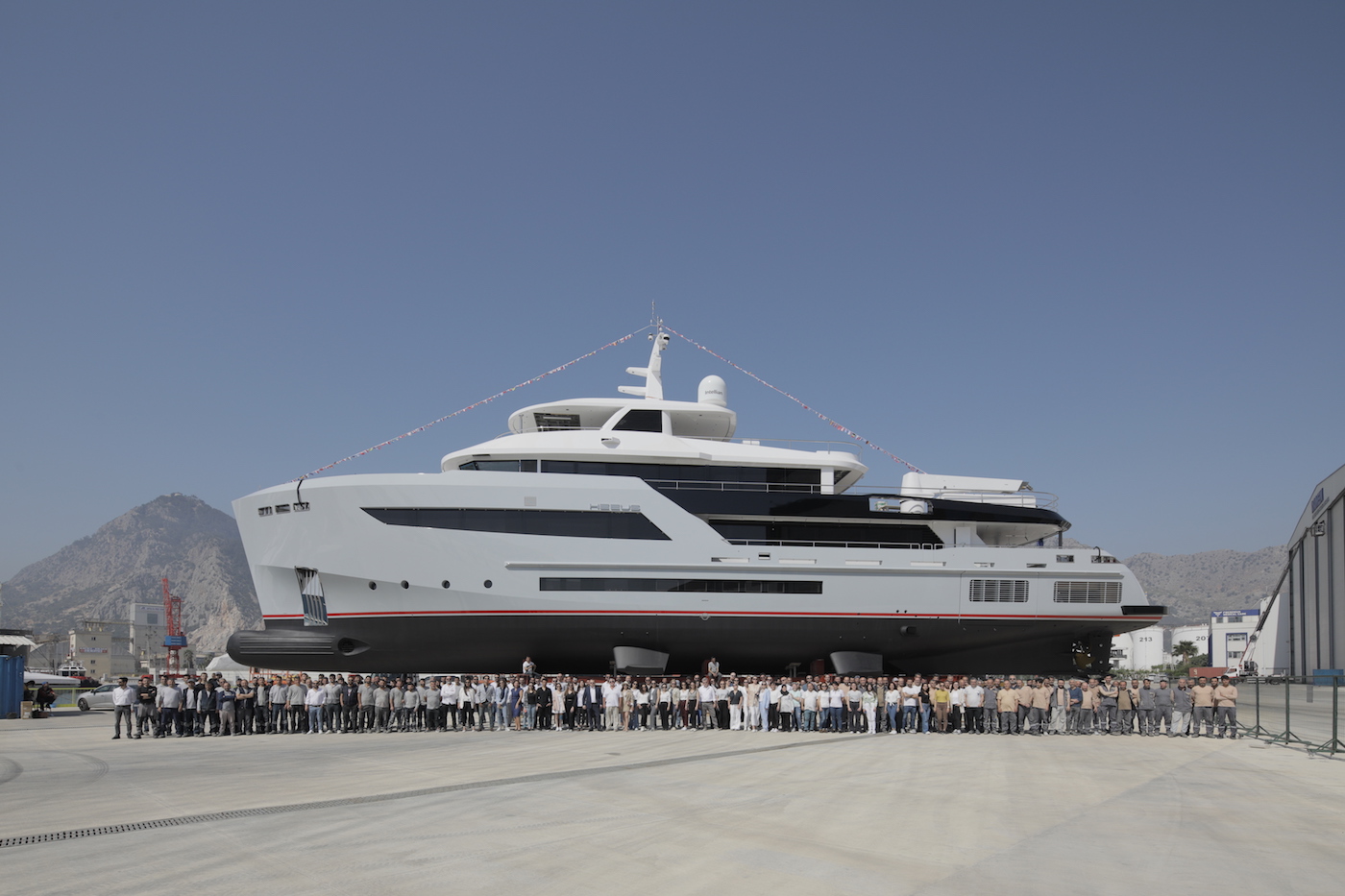 The 44.2m/145ft vessel was launched on Thursday the 28th of April at the Antalya shipyard in Turkey. She is a semi-custom vessel constructed with a steel hull and aluminium superstructure with naval architecture by the shipyard’s in-house team.