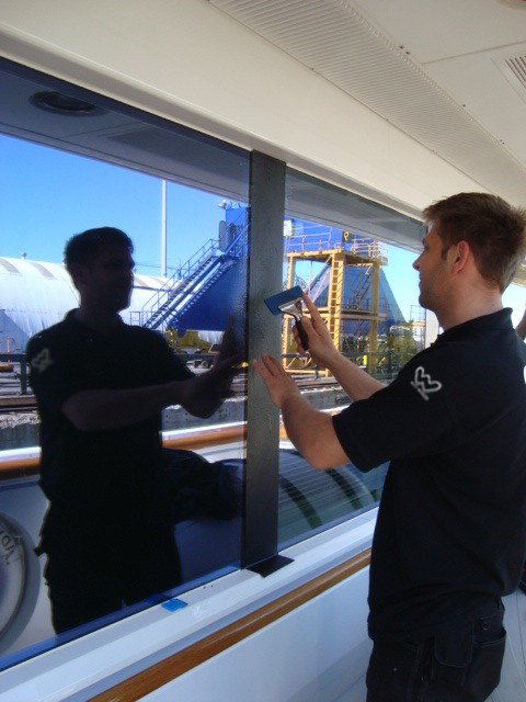 So after consultation between the Captain and the Directors of Wild Group International it was agreed that a marine grade blue tint vinyl film was the best solution, offering the perfect colour tint match. The Wild Group sourced a specific bespoke blue tint and answered all the captains’ questions about the material.
