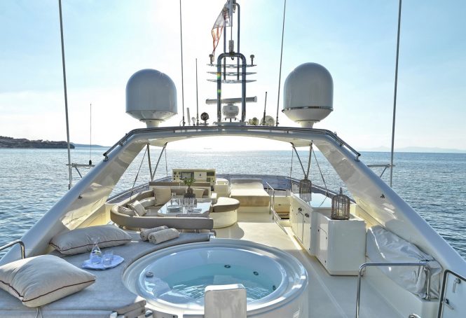 Outside, there is plenty of space for guests to relax and enjoy. On the main aft deck is an excellent al fresco dining setting. Above on the sundeck is the ultimate area for soaking up the sunshine. Here there is a circular jacuzzi placed aft with accompanying sunpad adjacent. Forward is another al fresco dining space, with plenty of room to seat all 8 guests. The foredeck boasts more sunbeds, making for a great spot to relax and watch the sights coming into view over the bow.