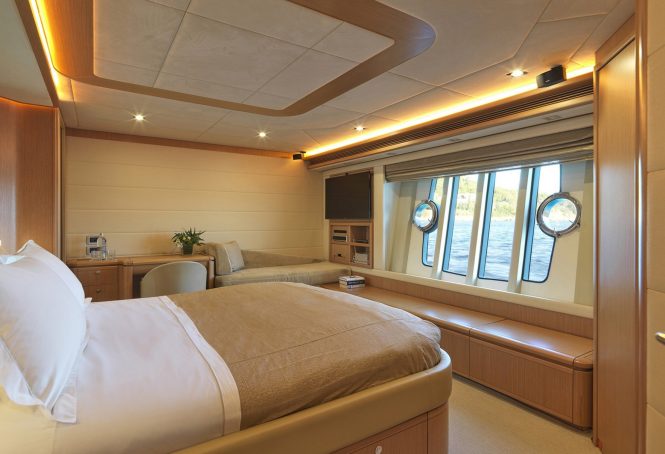 The main salon is drenched in natural light and sunshine thanks to the large panoramic windows surrounding the space, as well as the floor to ceiling glass doors leading to the aft deck. The salon features a lounge area aft, with gorgeous neutral furnishings as well as pop-up TV in the buffet opposite. Forward is the amidships dining area as well as stairwell and the well-equipped galley. On the lower deck is the accommodation, which includes the full-width Master cabin with fabulous ensuite bathroom.