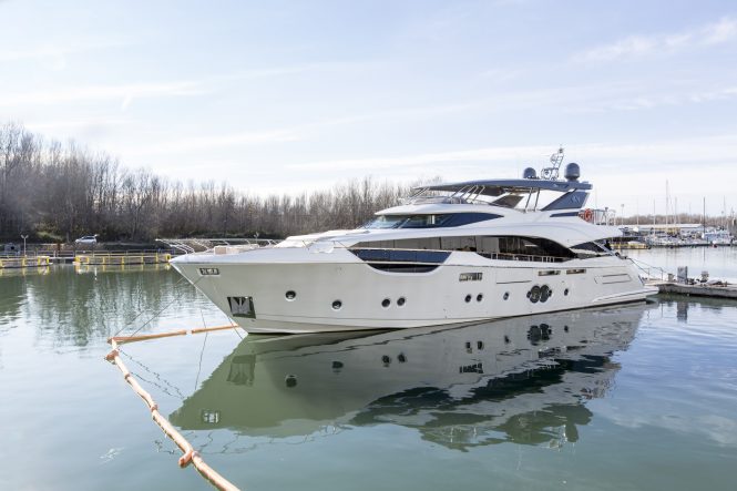 Launched in January, 33m/108ft motor yacht DECEMBER SIX is one of the first brand new charter yachts of 2018 and represents the second hull in the Navetta series from Ferretti. Her sturdy, militaristic styling comes from Zuccon International while Sarah Leet produced her black and white interiors in conjunction with the shipyard.