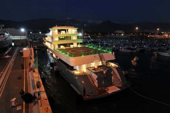 The outdoor areas are just as well equipped with sun loungers, sunpads and a Jacuzzi, and when the helicopter is stored in the hangar the expansive area can be used to host parties.