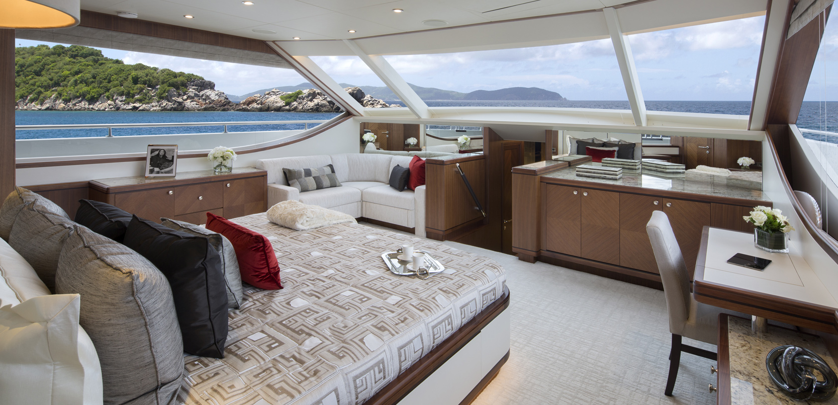 Whether chartering for a casual family holiday or for entertaining visitors, the interiors have a dusky charm that combines neo-classical and contemporary design with classic colour choices of dark wooden panelling and mottled cream fabrics. Deftly placed lighting sets the ambiance after sundown and during the day floor-to-ceiling windows in both the main salon and skylounge produce brightly-lit spaces with excellent views.