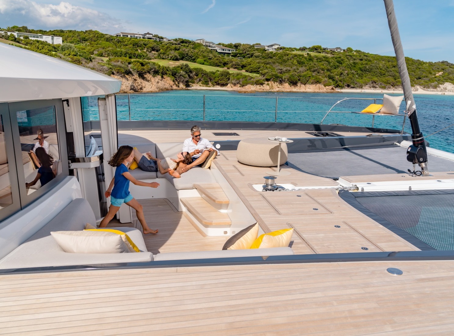 The large aft cockpit, connected to the open-plan main saloon has a fabulous al fresco dining area, plenty of seating and a direct access to the flybridge and also down to the transom. The forward area is perfect for a more private relaxation and is connected to the trampoline net.