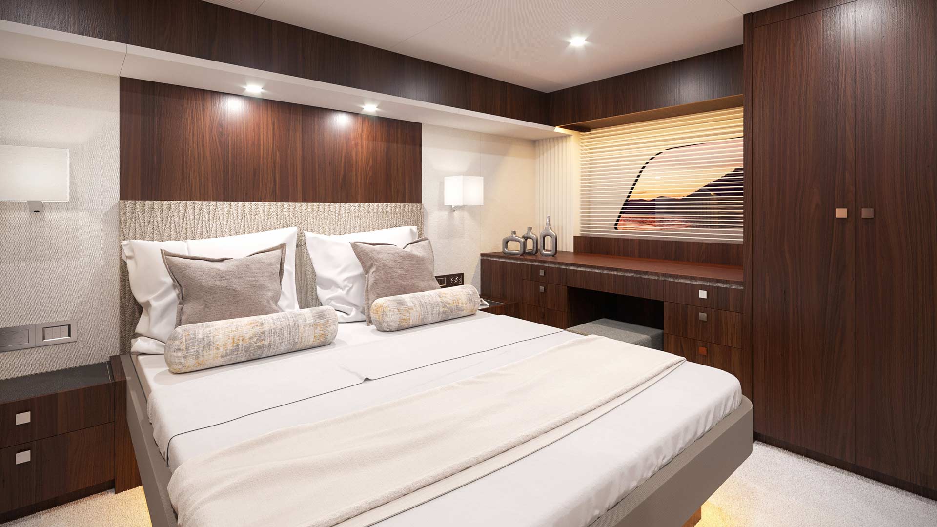 The collection of water toys is ideal for exploring the shallows around the Adriatic, snorkelling over wrecks, fishing for your lunch or simply lounging in the sunshine. To get around, the Volvo Penta IPS engines grant a top speed of 32 knots, a cruising speed of 24 knots and a range of 400 nautical miles.