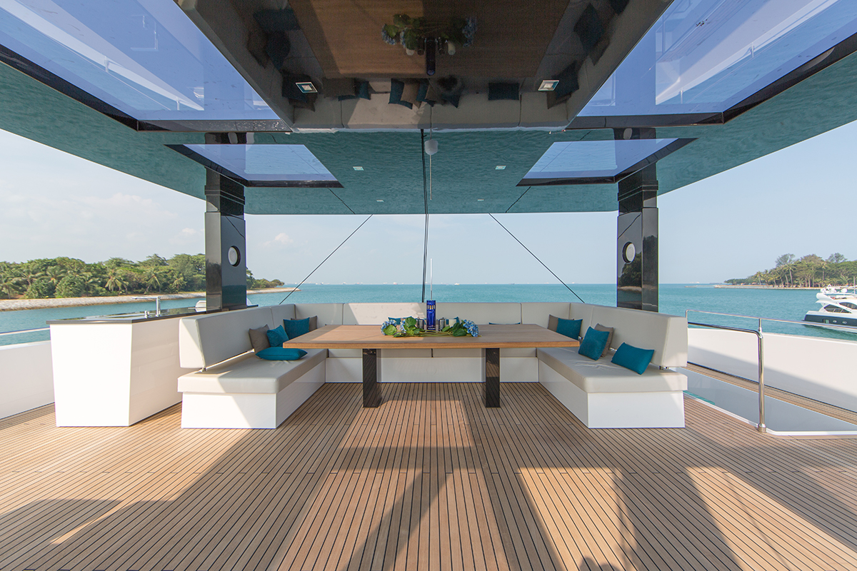 Thanks to the new superstructure design concept, the saloon and the exterior deck are on the same level, resulting in a huge main room enclosed by floor to ceiling glazed windows. This area opens up onto the cockpit and provides direct access to the deck through sliding foods on both sides of the yacht. The interior and the exterior connect into one vast relaxation and dining area.