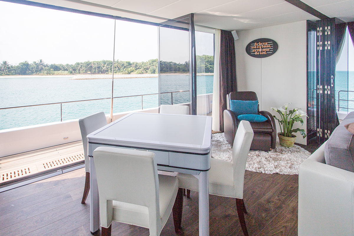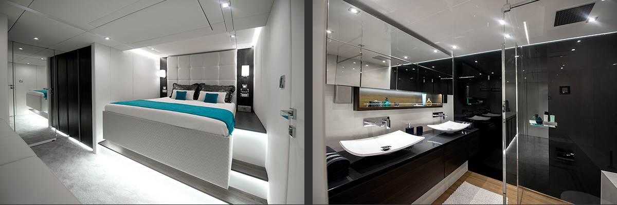 The accommodation layout includes two guest cabin with spacious private bathrooms with stone tiles, as all as two vast master suites. The port side staircase boasts a custom-built stairlift allowing access to a cabin for one of the Owner’s older family members. The master cabins include large double beds, a sofa, a drop-down TV, a spacious dressing room and bathroom.