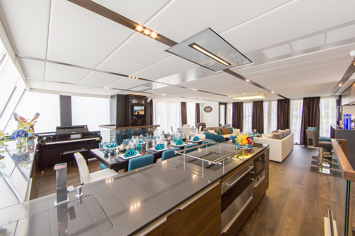 EAGLE WINGS is perfect for entertainment and puts a large emphasis on music. It includes a karaoke system and a large TV which drops down from the saloon’s ceiling. An upright piano is also located at the bow part of the saloon.