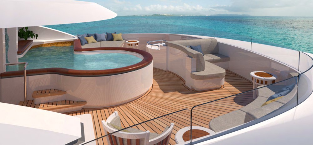 Exterior deck areas will provide plenty of space for social gatherings and entertainment. Dining-accessible bars, wide lounging areas are offered on each deck. A walk-up teak bar that serves a jetted pool with a mosaic-tile beach section and waterfall will be located on the sun deck.