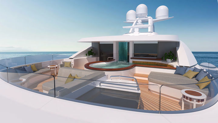 Spacious interior layout will be able to accommodate up to 12 guests over six rooms, including a bridge-deck VIP and a full-beam master suite on the main deck. An emphasis will be put on high ceilings, contrasting surfaces, stones and stunning furnishing.