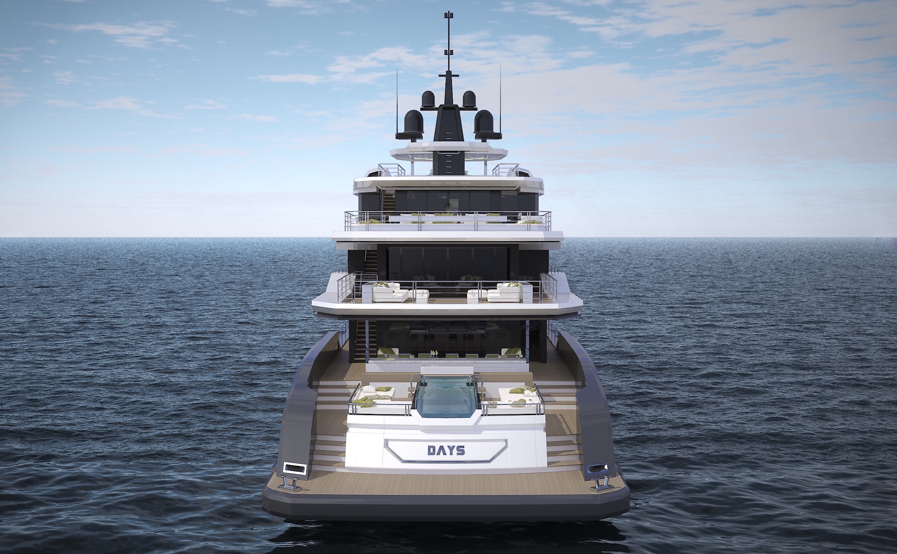 M/Y “Day’s” is promised to be a great vessel, meeting the industry’s latest trends and providing the highest safety standards. Large living spaces are provided over 5 decks. “Day’s” has a beam of 13m, while her gross tonnage will be more than 1,800 GT.
