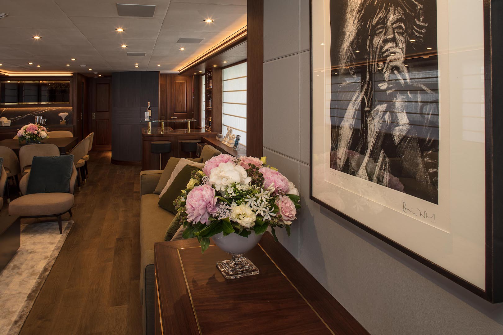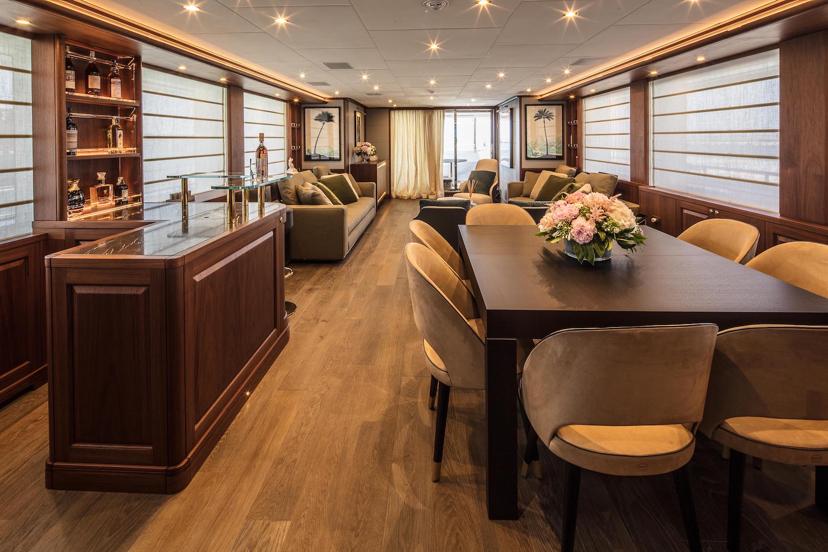 The interior designed by Arch. Pierluigi Floris is inviting and warm, featuring walkout wood tones combined with Poltrona Frau leathers, that cover 90% of the walls around the yacht. Classical style with modern touches is the main theme aboard, with such particularities as free standing furniture pieces by Minotti and Baxter.