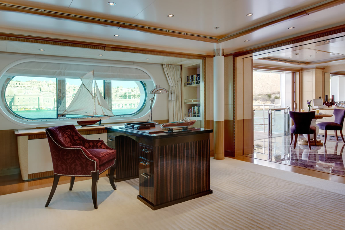 The decks on board superyacht Pegasus V (ex Princess Mariana) are extremely spacious and there are plenty of dining opportunities to choose from. One level up from the bridge deck is the party deck with two bars, casual seating areas, a raised dance floor, a grand piano, three cinema screens, a barbecue, sun beds and a Spa Pool spa pool! Forward is the Disco with lighted dance floor, Grand Piano and oversized bar. There are also two powder rooms on this level.