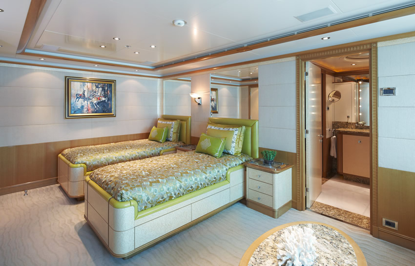 Master Stateroom of the M/Y PEGASUS V is located on the lower deck midship and features a king-sized bed, card table with 4 chairs and a sofa. “Her” bathroom has a steam shower and large Spa Pool bath tub. There is also a walk-in wardrobe with dressing vanity. “His” en-suite bathroom features a large steam shower and a walk-in closet.