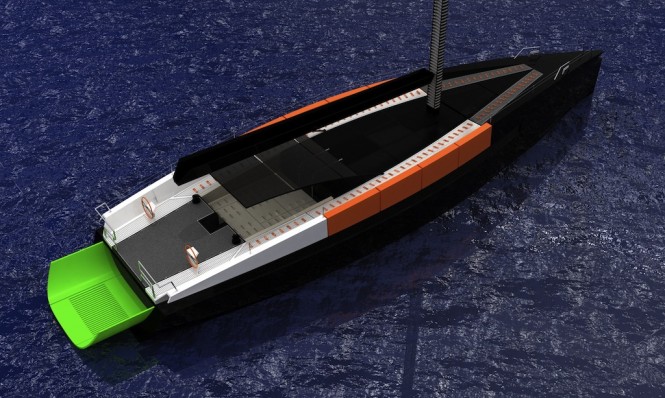 The yacht is very distinctive with her state-of-the-art design and distinctive colours. The apple-green swimming platform is one of the most interesting features, made of rigid polyurethane and thanks to its shape can be used for sunbathing. There is also a large aft deck suitable for picnics, which in case of need can be covered by an awning.