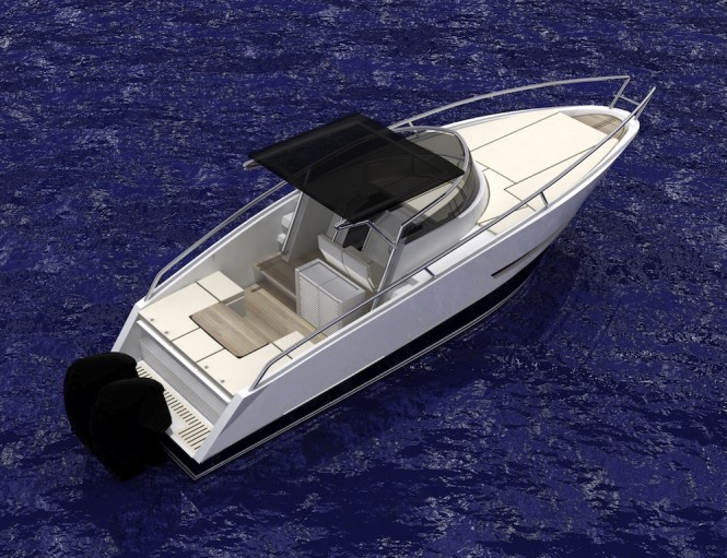 Carlo Cafiero Enfield 30 measures 9.44 metres in LOA and has a beam of 3.07 metres, featuring an elongated profile. here is a large external area both at the bow and aft of the motorboat, with the al-fresco dining area being protected by a large rigid polycarbonate bimini top. There is a large external area both at the bow and aft of the motorboat, with the al-fresco dining area being protected by a large rigid polycarbonate bimini top. Enfield 30 features an independent external kitchen, large sunbathing area aft, as well as at the bow.