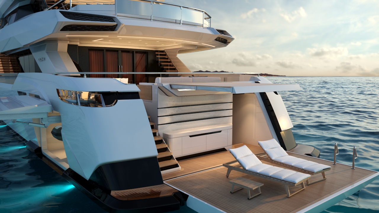 M/Y PROJECT DOM123 has accommodation designed around 10-12 guests on board sleeping in six en-suite cabins (including a main deck Master suite with a private fold-down balcony), with a crew of 8-9 depending on whether she is being used privately or commercially.