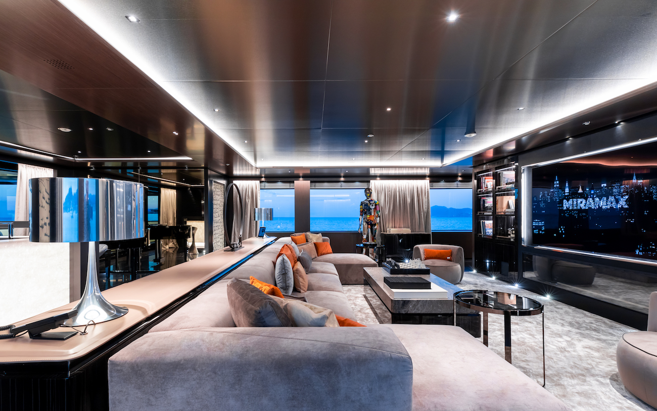Her interior décor is refined and truly elegant, featuring soothing toned fabrics, beautiful wood finishes, bespoke detailing and custom art pieces. From the main salon to the upper sky-lounge, there are ample areas to entertain or simply relax. Both offer plush seating and full audio/visual equipment, panoramic windows and endless possibilities. The main salon is set to a contemporary open plan, with a sumptuous lounge and formal dining, while her upper deck has a lovely lounge, wet bar and even a piano.