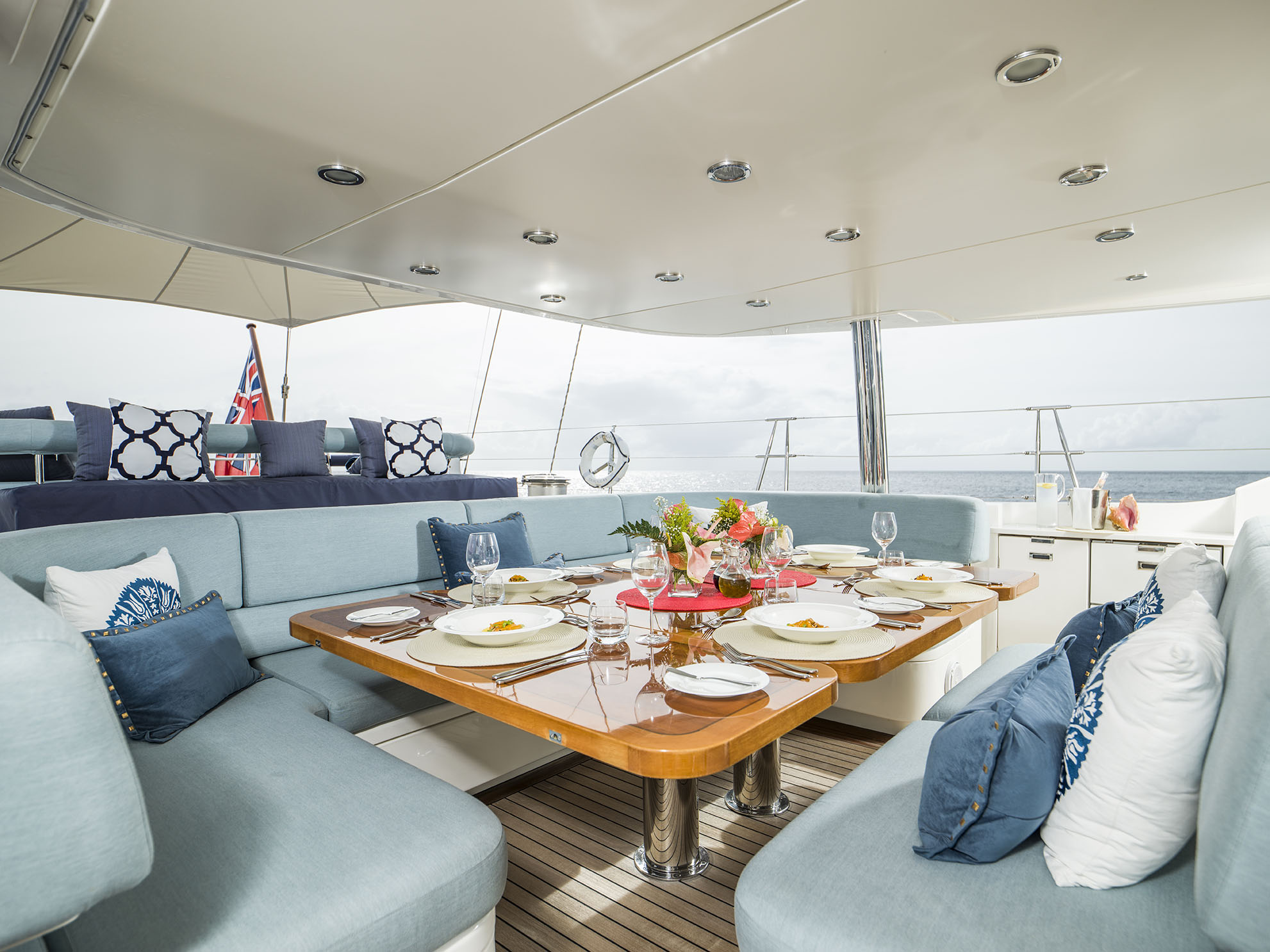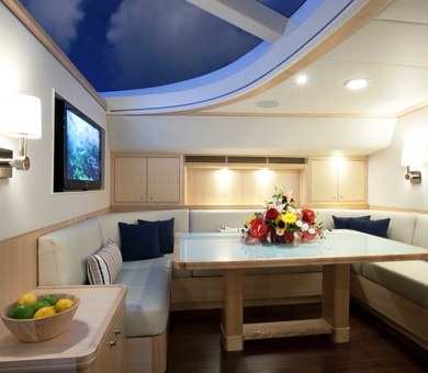 Shaded sunpads on the main deck aft offer guests a place to stretch out and relax, however the bridge deck will command attention with the grand alfresco dining table and the arresting spa pool covered in glimmering mosaic-like tiles.