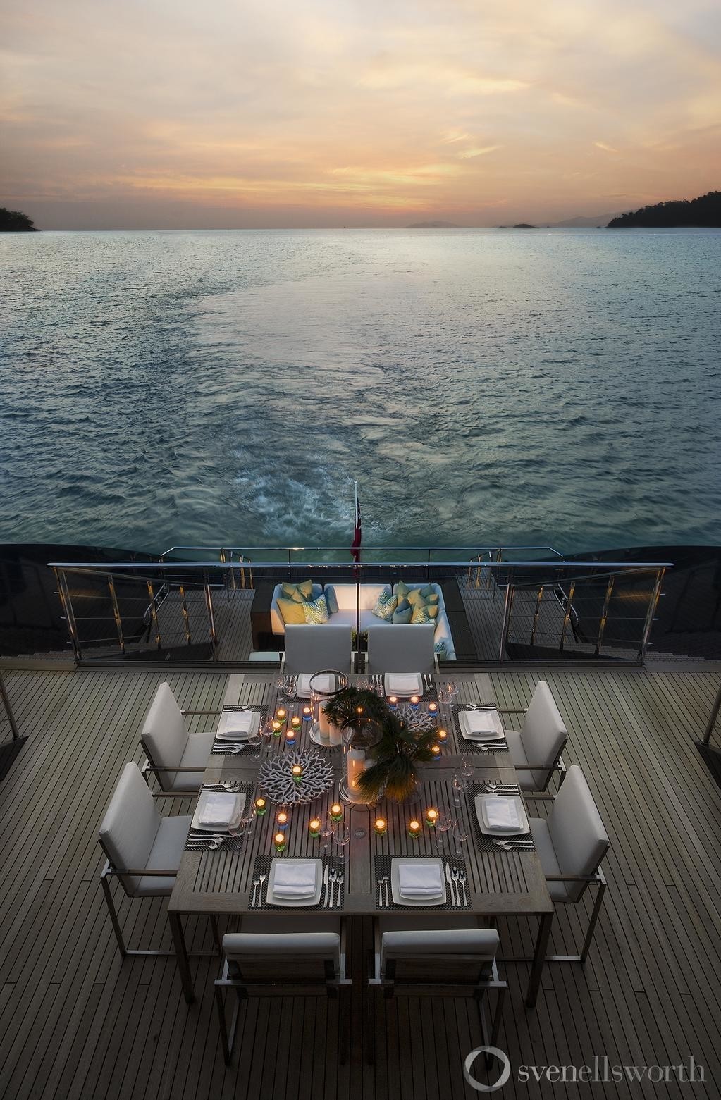 Finished in a contemporary styling, her interiors are welcome, light and chic. The main salon is open plan with the dining, creating the ideal social space to gather with friends and family. An upper sky lounge features an equally comfortable design, with a casual flair, offering a sumptuous seating area and dining table.
