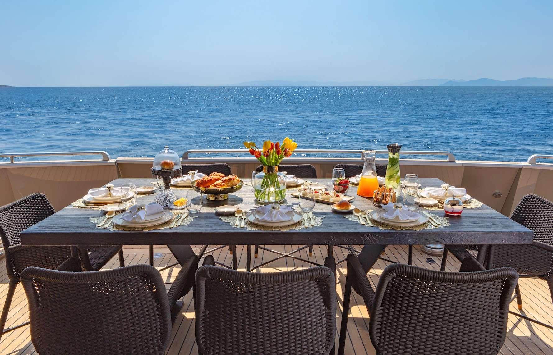 She has a generous sundeck, complete with alfresco dining, sunning options, and a service station for refreshments.