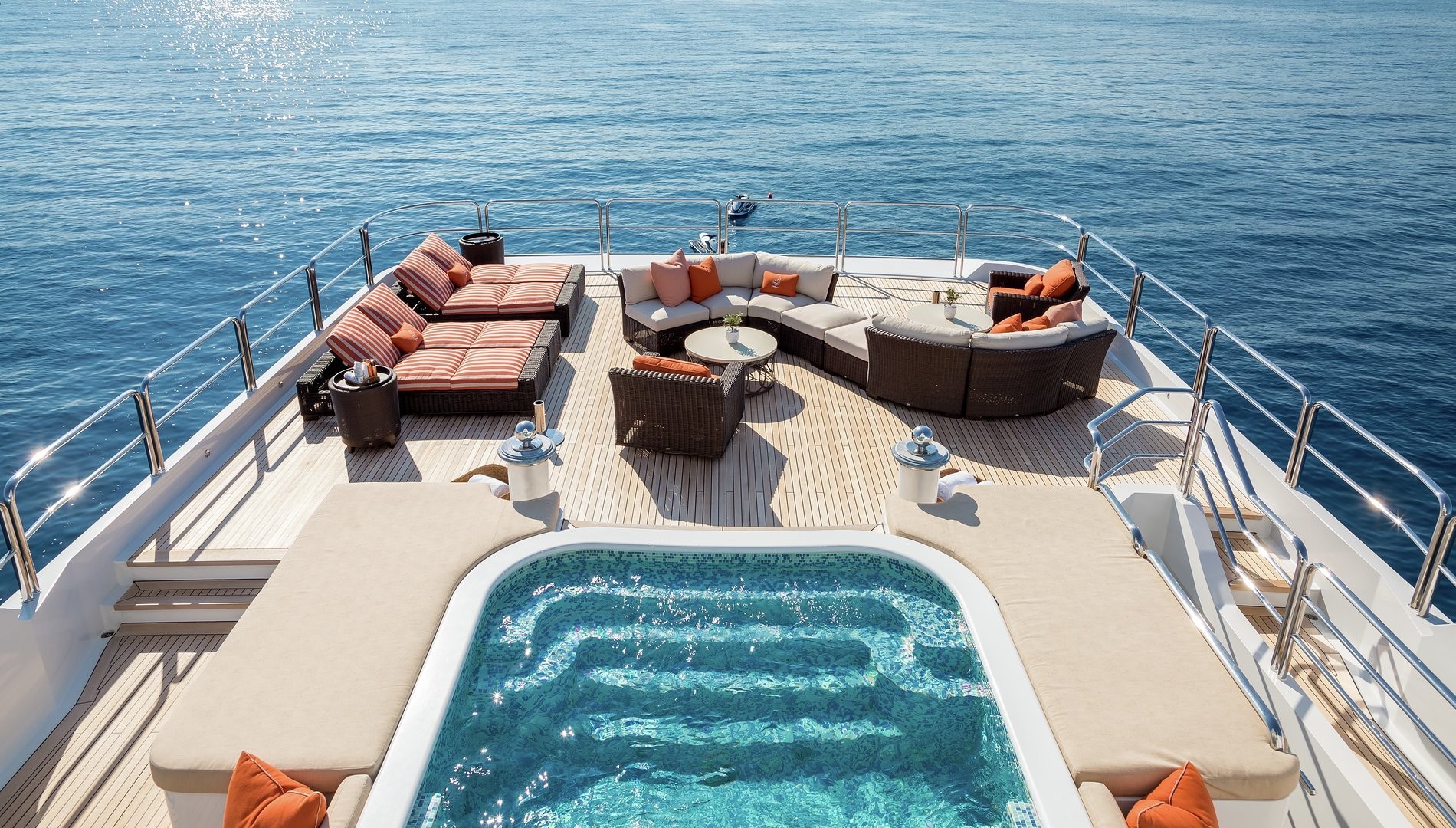 Spend your evening entertaining on the sundeck, with an incredible-looking plunge pool aft of the centre and sun loungers along the stern. In the mid section, guests have a choice of lounging and alfresco dining spaces with a bar to serve refreshments, while the forward seating curves around the bow and receives plenty of sunshine.