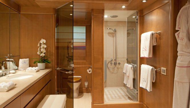 The accommodation is designed to sleep a maximum of 12 guests across 6 cabins: 1 Master suite, 1 VIP stateroom, 3 double cabins and 1 twin cabin. The professional crew of 14 will provide guests with everything they need for a relaxing cruise among such locations as the Leeward or Windward Islands.
