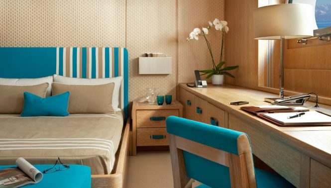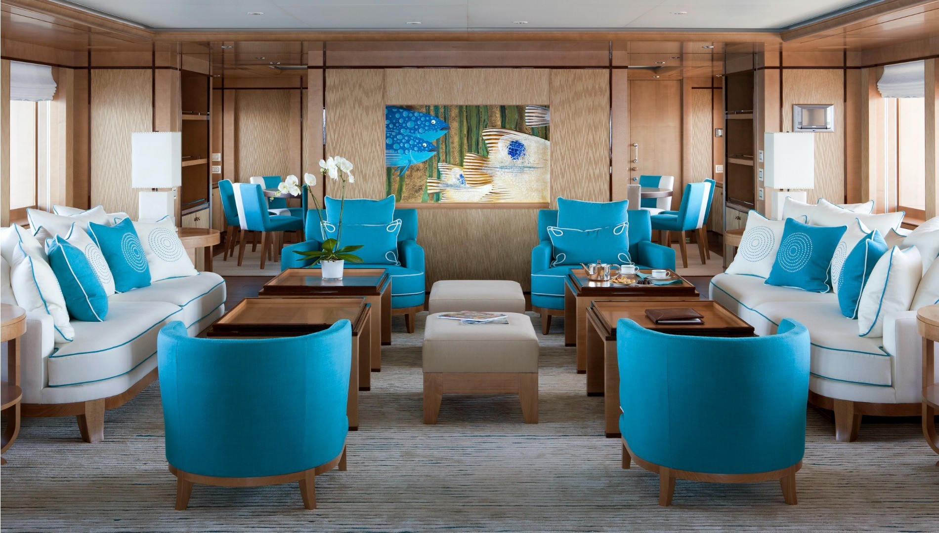 The main salon uses light wood panelling with matching furnishings in white and aqua blue. Modern artwork blends seamlessly into the environment and decorates both the lounge and the forward formal dining area, which seats up to 16 guests and visitors around two circular tables.