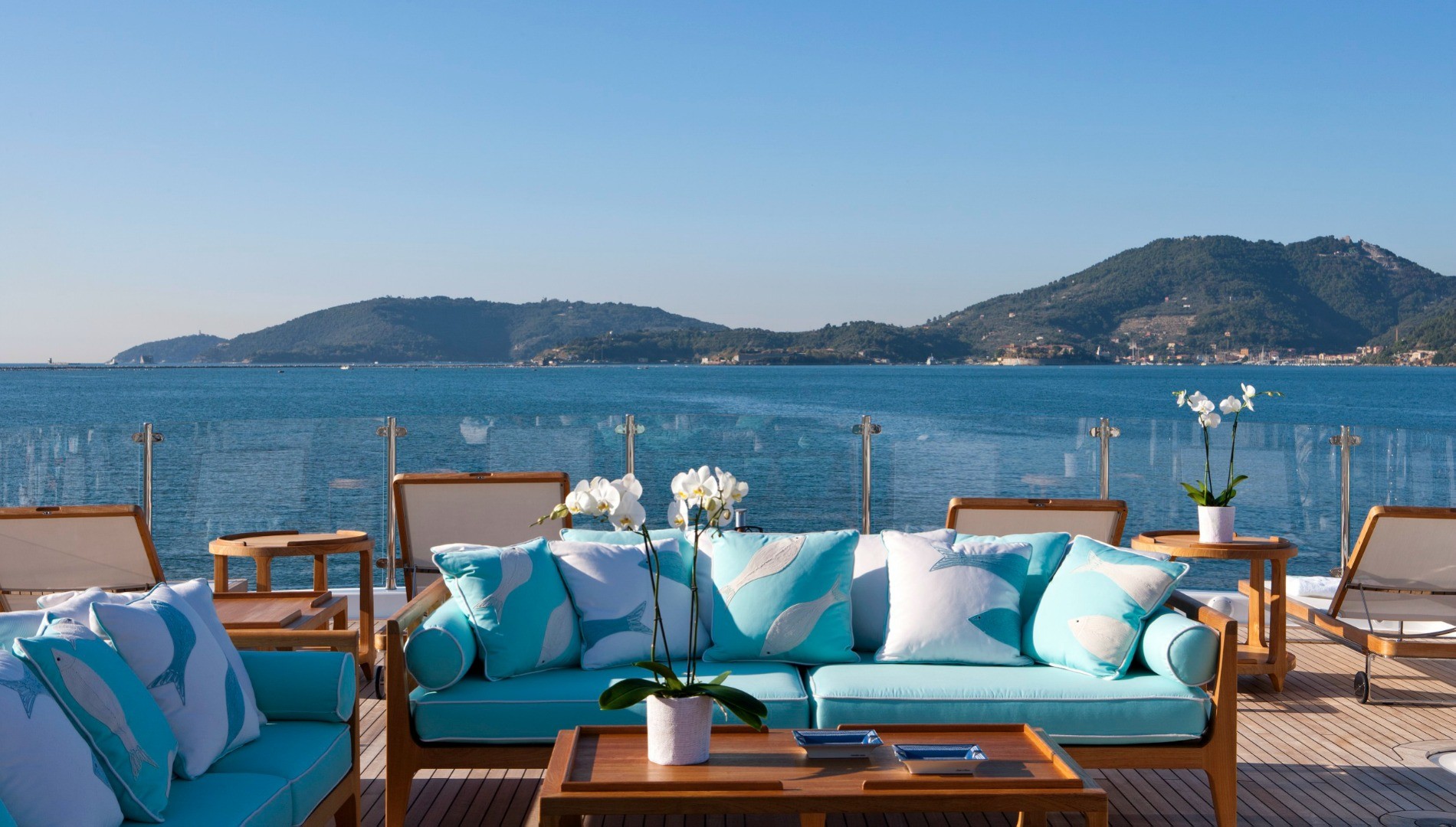 The main deck aft is laid out for the perfect beginning to your mornings on board, where guests can gather around and enjoy breakfast in the sunshine. Stairways connect with the lower deck swim platform, where guests can access the tenders and the water toys for hours of fun in the water.