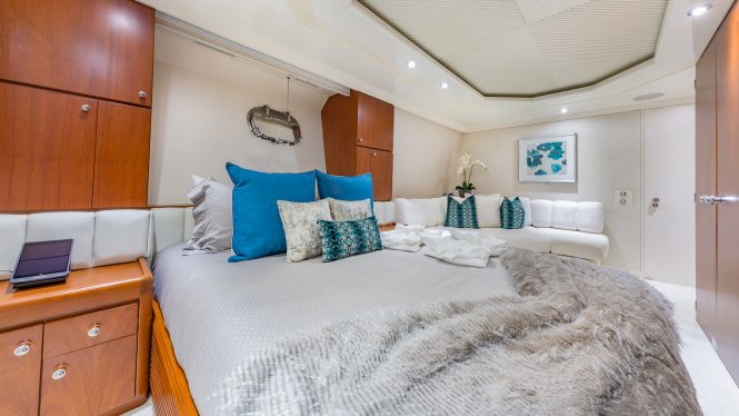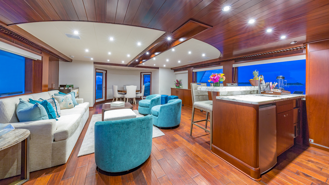 Both the main deck and skylounge offer plush social settings combining contemporary styling with classic touches in the wooden-panelled surroundings. Broad windows span both lengths of the port and starboard sides, so that guests can take in the gorgeous white-sand beaches and azure blue waters from the main salon bar or the sumptuous skylounge armchairs.