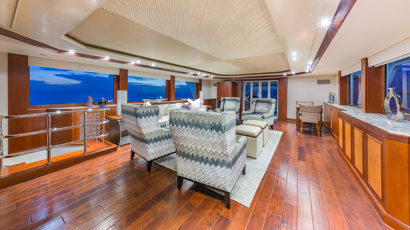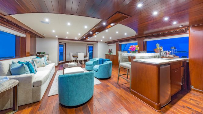 Above on the upper deck aft the windows offer 180 views while guests dine sheltered from the strong breezes of the Grenadines. After a meal, there is plenty of additional seating for comfortable relaxation taking in the beautiful British Virgin Islands and the regattas as St. Barths this winter.