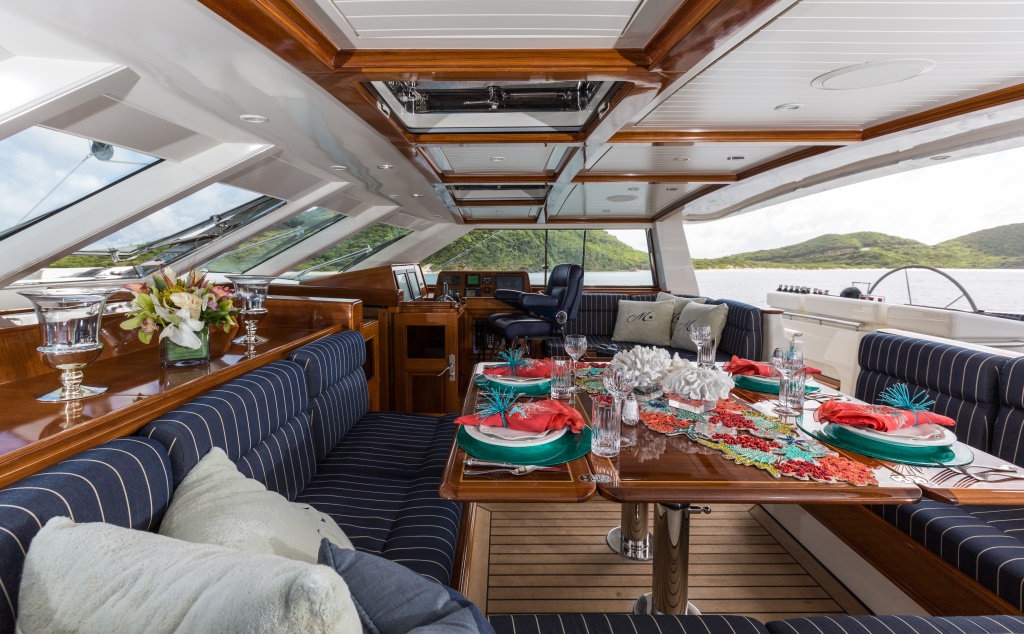 After working up an appetite, the formal dining area will be a welcome sight within the air-conditioned interior, or guests can choose instead to have an informal meal in the upper salon, shaded from the heat of the midday sun and exposed to the fresh sea air.